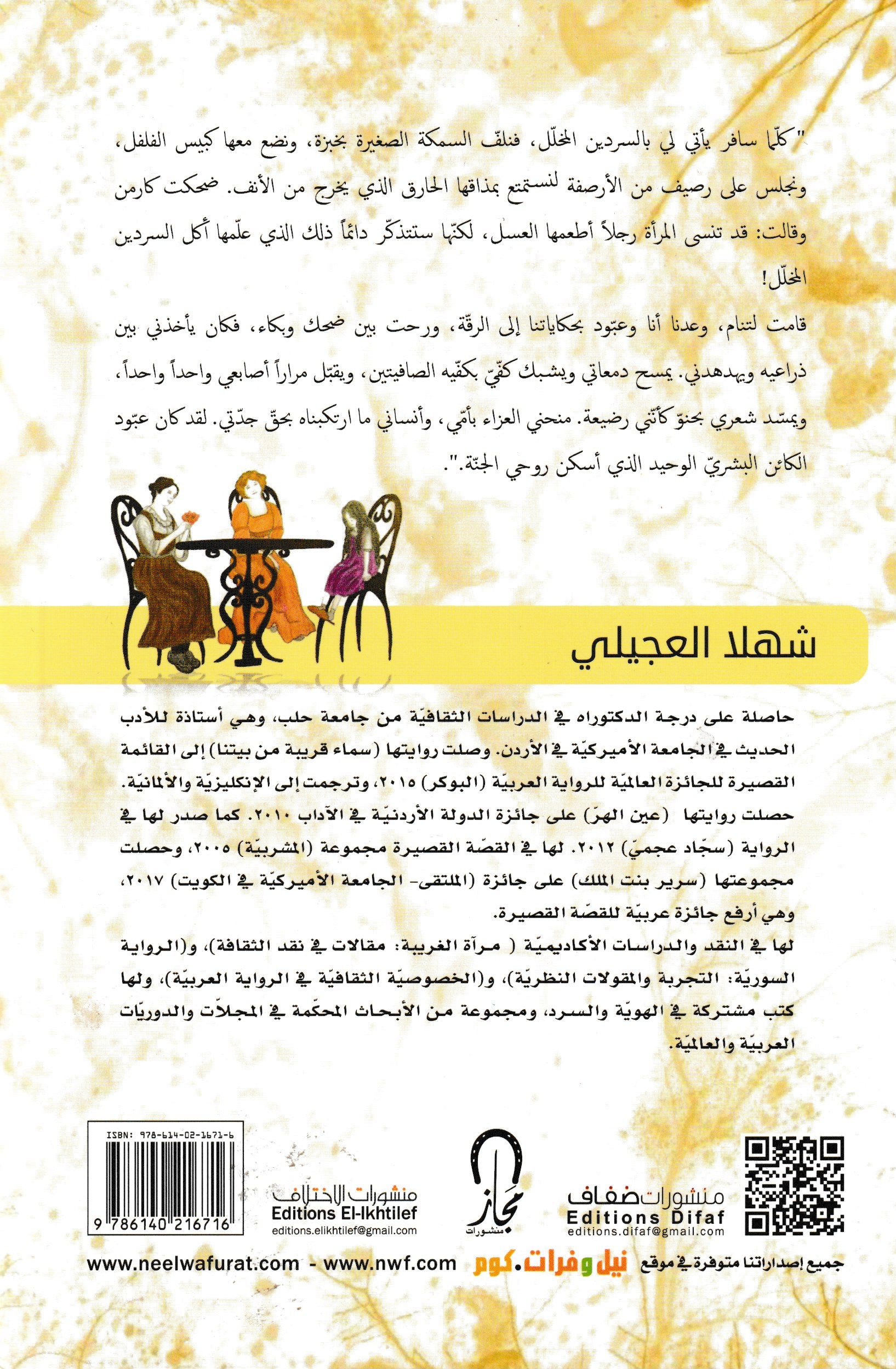 قامت لتنام، وعدنا أنا وعبّود بحكاياتنا إلى الرقّة، ورحت بين ضحك وبكاء، فكان يأخذني بين ذراعيه ويهدهدني. يمسح دمعاتي ويشبك كفيّ بكفّيه الصافيتين، ويقبّل مراراً أصابعي واحداً واحداً، ويمسّد شعري بحنوّ كأنني رضيعة. منحني العزاء بأمّي، وأنساني ما ارتكبناه بحق جدتي. لقد كان عبود الكائن البشري الوحيد الذي أسكن روحي الجنة".
